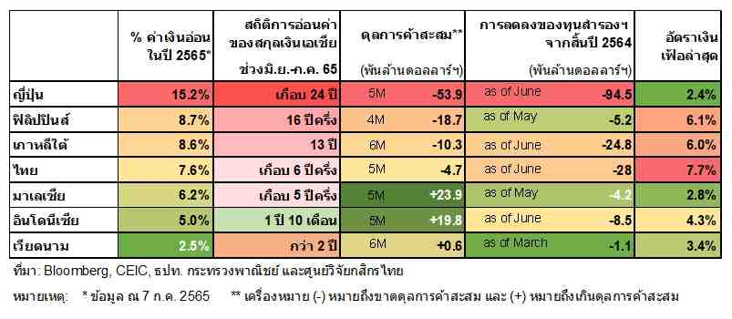 การอ่อนค่าของสกุลเงินในเอเชีย นอกจากจะมีผลกระทบทางอ้อมไปยังสถานการณ์เงินเฟ้อแล้ว ยังมีผลกระทบต่อดุลการค้าในระดับที่แตกต่างกัน บางประเทศมีดุลการค้าที่พลิกมาเป็นขาดดุล เนื่องจากค่าเงินที่อ่อนทำให้มูลค่าการนำเข้าเร่งตัวสูงขึ้น เพราะประเทศเหล่านั้นยังต้องมีการนำเข้าสินค้าที่จำเป็น โดยเฉพาะในหมวดน้ำมันและสินค้าโภคภัณฑ์ ในกรณีของไทยบันทึกยอดขาดดุลการค้าในช่วง 5 เดือนแรกของปี 2565 ที่ 4.73 พันล้านดอลลาร์ฯ เช่นเดียวกับญี่ปุ่น ฟิลิปปินส์ และเกาหลีใต้ อย่างไรก็ดีมาเลเซีย อินโดนีเซีย และเวียดนาม ยังคงบันทึกยอดเกินดุลการค้าได้ในปีนี้ เนื่องจากโครงสร้างสินค้าส่งออกที่มีสัดส่วนสินค้าโภคภัณฑ์และอิเล็กทรอนิกส์สูง และค่าเงินที่มีอัตราการอ่อนค่าน้อยกว่า
