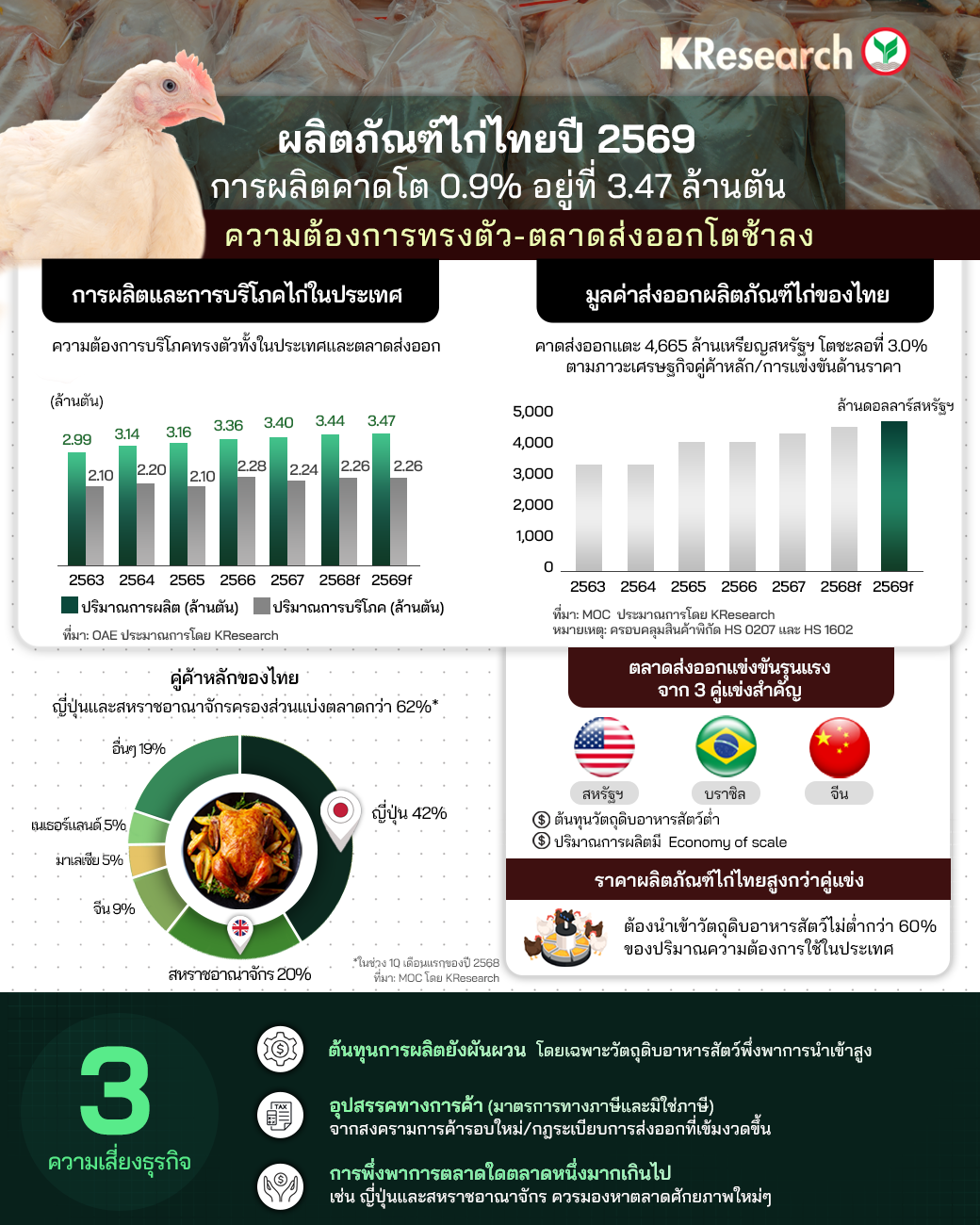แม้ว่าไทยจะมีจุดแข็งในเรื่องคุณภาพและมาตรฐาน รวมถึงการใช้เทคโนโลยีแปรรูปและพัฒนาสินค้าให้ได้ตามออเดอร์ลูกค้า แต่ก็มีความเสี่ยงจากคู่แข่งรายสำคัญอย่าง สหรัฐฯ บราซิลและจีน ที่มีความได้เปรียบด้านต้นทุนวัตถุดิบอาหารสัตว์ที่ต่ำ รวมถึงปริมาณการผลิตที่มี Economy of scale