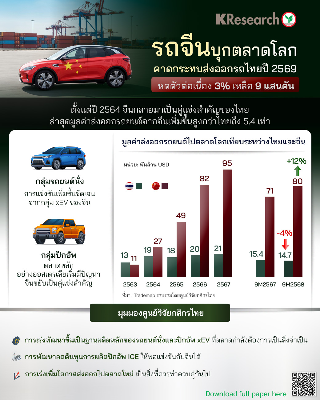 - การส่งออกรถยนต์ไทยกำลังถูกจีนเข้าแย่งตลาดมากขึ้นเรื่อย ๆ โดยในกลุ่มรถยนต์นั่งพบการแข่งขันที่เพิ่มขึ้นชัดเจนจากกลุ่ม xEV จากจีน ส่วนกลุ่มปิกอัพแม้ยังส่งออกได้ดี แต่ตลาดหลักอย่างออสเตรเลียเริ่มมีปัญหา โดยจีนได้ขยับขึ้นเป็นหนึ่งคู่แข่งสำคัญ ซึ่งลักษณะเดียวกันนี้เกิดขึ้นกับในอีกหลายตลาด