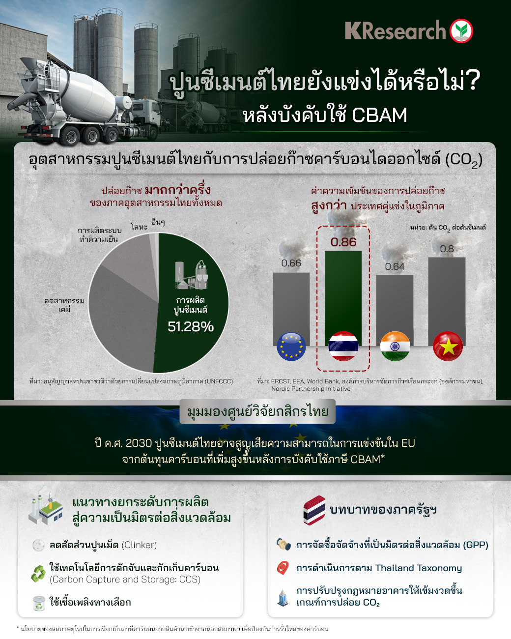 - ศูนย์วิจัยกสิกรไทยประเมินว่า ภายในปี 2030 ต้นทุนคาร์บอนที่เพิ่มสูงขึ้นอาจทำให้อุตสาหกรรมปูนซีเมนต์ไทยสูญเสียความสามารถในการแข่งขันใน EU เมื่อเทียบกับประเทศคู่แข่งในภูมิภาคหรือการผลิตในภายใน EU เอง