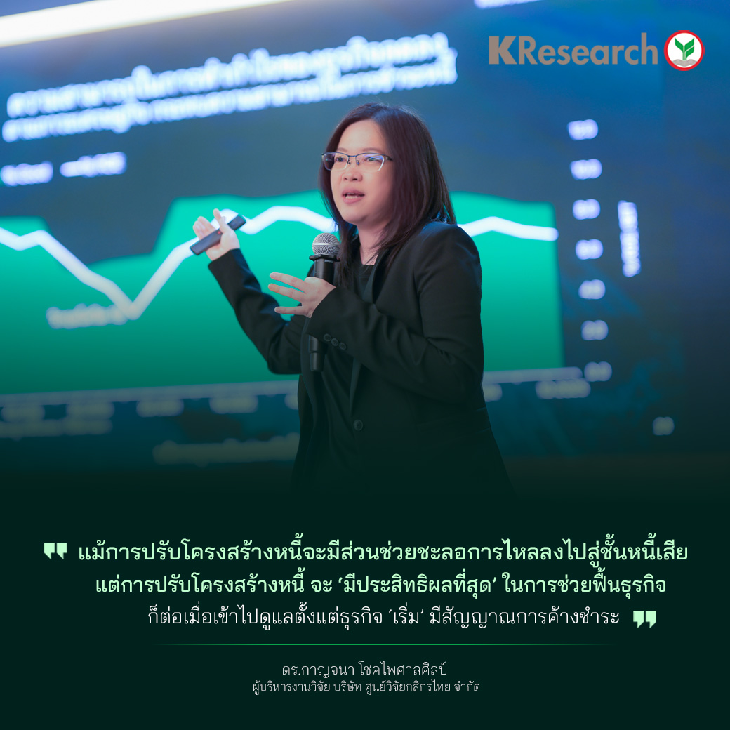 ดร.กาญจนา โชคไพศาลศิลป์ ผู้บริหารงานวิจัย บริษัท ศูนย์วิจัยกสิกรไทย จำกัด กล่าวว่า ผลจากการจัดกลุ่มบัญชีสินเชื่อธุรกิจใหม่ตามลักษณะพฤติกรรมการชำระหนี้ของลูกหนี้ในรอบหนึ่งปีที่ผ่านมา ออกเป็น 4 กลุ่ม ประกอบด้วย สถานะปกติ (Good) เริ่มไม่ปกติ (Newly Impaired) ดีสลับแย่ (On-Off) และ มีปัญหารุนแรง (Distressed) พบว่า 95% ของจำนวนบัญชีสินเชื่อธุรกิจ ยังจัดอยู่ในกลุ่มสถานะปกติ แต่จุดที่น่าสนใจคือ สัดส่วนจำนวนบัญชีที่จัดอยู่ในกลุ่มสถานะปกตินี้เริ่มทยอยลดลงในช่วงหลังโควิด ขณะที่ กลุ่มดีสลับแย่และกลุ่มที่มีปัญหารุนแรง เพิ่มสูงขึ้น ทั้งนี้ ภาพดังกล่าว สะท้อนผลกระทบจากปัญหาเศรษฐกิจหลายระลอกที่กระทบความสามารถในการทำกำไรของธุรกิจไทย โดยธุรกิจยิ่งเล็ก ยิ่งมีสัดส่วนของบัญชีสินเชื่อกลุ่มสถานะปกติลดลงเมื่อเวลาผ่านไป นอกจากนี้ แม้การปรับโครงสร้างหนี้จะมีส่วนช่วยชะลอการไหลลงไปสู่ชั้นหนี้เสีย แต่การปรับโครงสร้างหนี้ จะ ‘มีประสิทธิผลที่สุด’ ในการช่วยฟื้นธุรกิจ ก็ต่อเมื่อเข้าไปดูแลตั้งแต่ธุรกิจ ‘เริ่ม’ มีสัญญาณการค้างชำระ ไม่ใช่เข้าไปดูแลหลังจากที่กลายเป็นเอ็นพีแอลไปแล้ว เพราะโอกาสการฟื้นตัวของหนี้เอ็นพีแอลกลับมาสู่การจัดชั้นที่ดีขึ้น (ภายในกรอบระยะเวลา 1 ปีหลังจากปรับโครงสร้างหนี้) จะมีไม่ถึง 10%