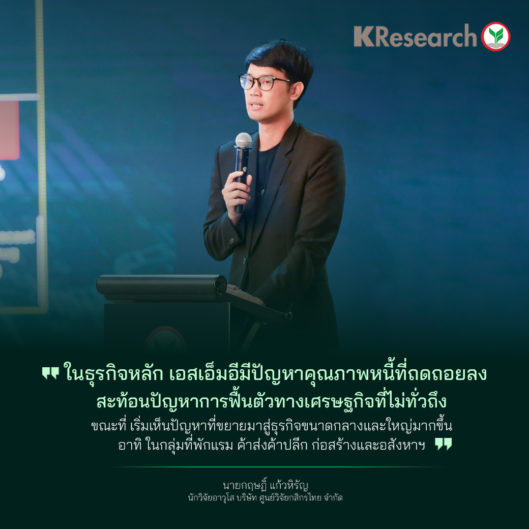 นายกฤษฏิ์ แก้วหิรัญ นักวิจัยอาวุโส บริษัท ศูนย์วิจัยกสิกรไทย จำกัด เปิดเผยว่า จากข้อมูลคุณภาพหนี้จำแนกตามประเภทธุรกิจพบว่า ธุรกิจที่เชื่อมโยงกับกำลังซื้อของตลาดในและต่างประเทศ เช่น ภาคการผลิตและกลุ่มที่พักแรม ความน่ากังวลจะอยู่ที่ธุรกิจขนาดใหญ่ที่มีสัดส่วนหนี้ค้างชำระเกิน 30 วันขึ้นไป อยู่ในระดับสูงที่สุด และส่วนที่เป็นธุรกิจเอสเอ็มอีรายเล็ก-ย่อย เริ่มเห็นภาพหนี้ค้างชำระที่เพิ่มขึ้น ขณะที่ธุรกิจที่เชื่อมโยงกับกำลังซื้อของตลาดในประเทศ เช่น ธุรกิจค้าส่งค้าปลีก พบว่าคุณภาพหนี้ที่ด้อยลงในกลุ่มเอสเอ็มอีรายเล็ก-ย่อยในช่วงก่อนหน้านี้ ได้ขยายมาสู่ธุรกิจขนาดกลางมากขึ้น ส่วนธุรกิจก่อสร้างและอสังหาริมทรัพย์ ภาพลบจะขยายมาถึงธุรกิจขนาดใหญ่ด้วย ซึ่งด้วยแนวโน้มเศรษฐกิจที่มีความไม่แน่นอนสูงขึ้น ทั้งจากผลของการขึ้นภาษีนำเข้าของสหรัฐฯ ที่กระทบการส่งออก และภาพกำลังซื้อในประเทศที่ซบเซา อาจทำให้แนวโน้มความสามารถในการชำระหนี้ของประเภทธุรกิจต่าง ๆ ข้างต้น มีโอกาสถดถอยลงอีกในไตรมาสที่เหลือของปีนี้