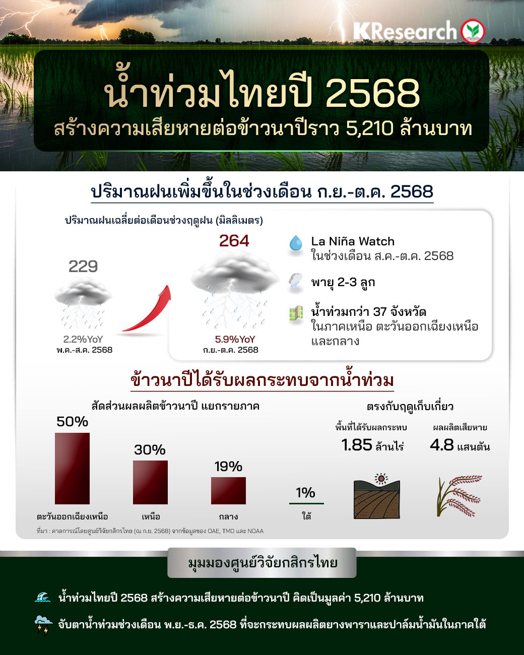 • ศูนย์วิจัยกสิกรไทย ประเมินว่า น้ำท่วมไทยปี 2568 สร้างความเสียหายต่อข้าวนาปี คิดเป็นมูลค่า 5,210 ล้านบาท นอกจากนี้ ยังต้องจับตาน้ำท่วมช่วงเดือนพ.ย.-ธ.ค. ที่จะกระทบผลผลิตยางพาราและปาล์มน้ำมันในภาคใต้