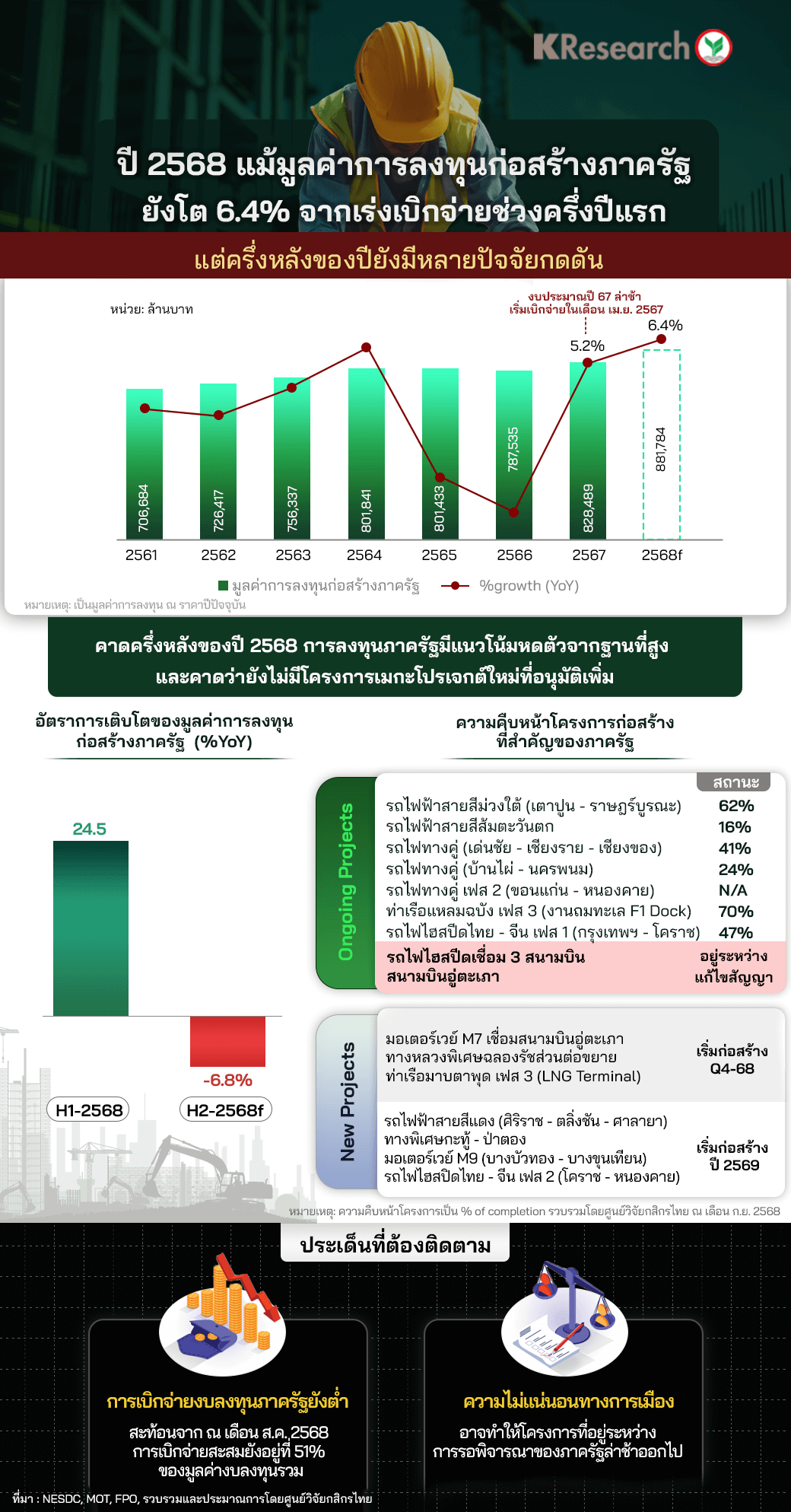 • มูลค่าการลงทุนก่อสร้างภาครัฐทั้งปี 2568 คาดอยู่ที่ 8.8 แสนล้านบาท โต 6.4% จากปีก่อน โดยแรงหนุนหลักมาจากการเร่งเบิกจ่าย และผลของฐานต่ำในช่วงครึ่งปีแรก