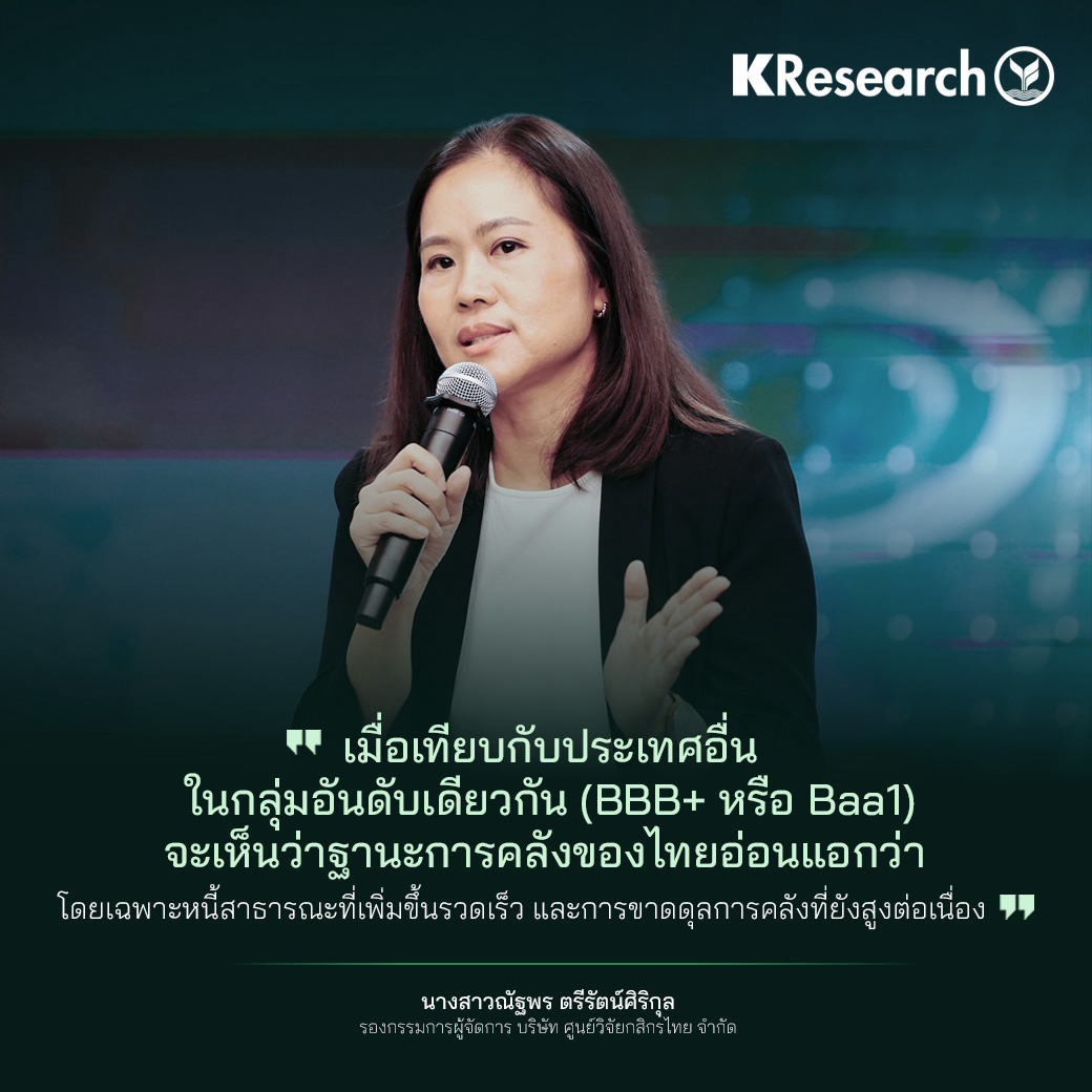 นางสาวณัฐพร ตรีรัตน์ศิริกุล รองกรรมการผู้จัดการ บริษัท ศูนย์วิจัยกสิกรไทย จำกัด กล่าวว่า เมื่อเปรียบเทียบกับประเทศอื่นในกลุ่มอันดับเดียวกัน (BBB+ หรือ Baa1) จะเห็นว่าฐานะการคลังของไทยอ่อนแอกว่า โดยเฉพาะหนี้สาธารณะที่เพิ่มขึ้นรวดเร็ว และการขาดดุลการคลังที่ยังสูงต่อเนื่อง ทั้งนี้ ในกรณีเศรษฐกิจไทยเติบโตเพียง 2% ต่อปีในระยะข้างหน้า การขาดดุลการคลังอาจยังอยู่สูงกว่า -4.0% ของ GDP และหนี้สาธารณะมีแนวโน้มแตะกรอบเพดาน 70% ภายในปี 2570 ทั้งนี้ รัฐบาลไทยอยู่ระหว่างการทบทวนแผนการคลังระยะปานกลาง ซึ่งน่าจะเห็นรายละเอียดแผนลดการขาดดุลการคลังที่ชัดเจนขึ้น