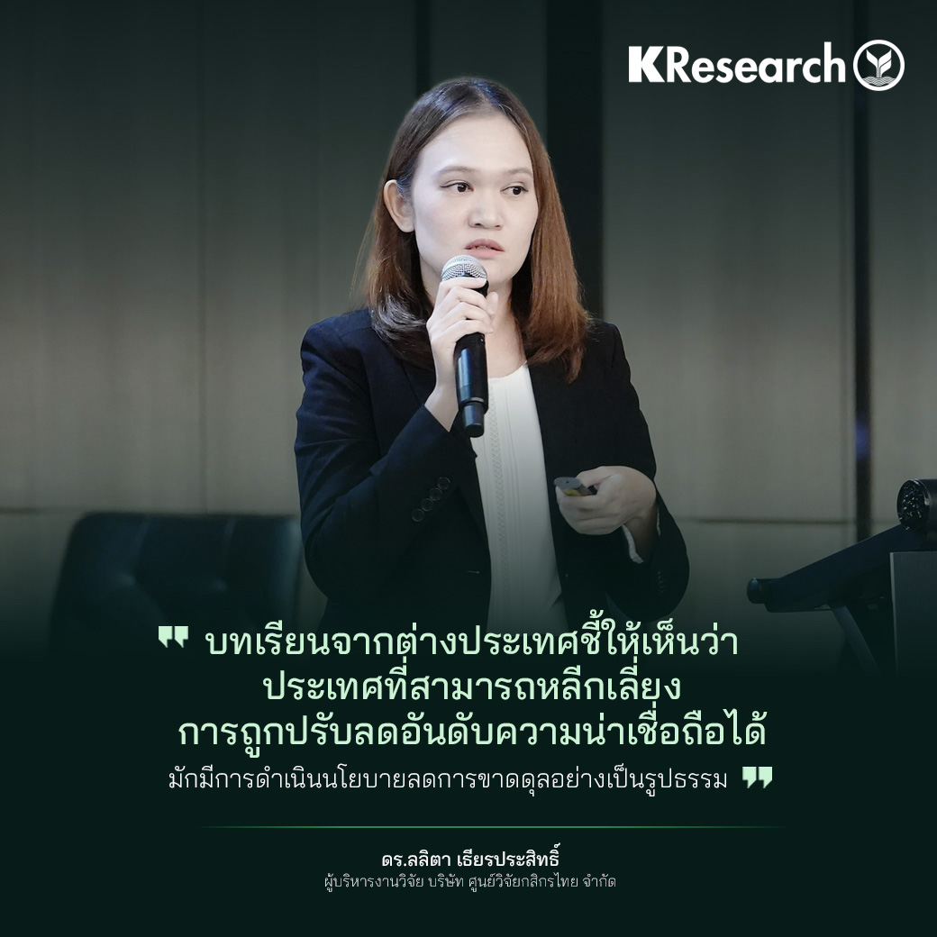 ดร.ลลิตา เธียรประสิทธิ์ ผู้บริหารงานวิจัย บริษัท ศูนย์วิจัยกสิกรไทย จำกัด กล่าวว่า บทเรียนจากต่างประเทศชี้ให้เห็นว่า ประเทศที่สามารถหลีกเลี่ยงการถูกปรับลดอันดับความน่าเชื่อถือได้ มักมีการดำเนินนโยบายลดขาดดุลอย่างเป็นรูปธรรม ตัวอย่างเช่น อิตาลี ที่สามารถลดการขาดดุลจาก 8.0% เหลือต่ำกว่า 4.0% ของ GDP ภายในระยะเวลาไม่กี่ปี ผ่านแผนเพิ่มรายได้ ลดรายจ่าย และปรับปรุงประสิทธิภาพการใช้จ่ายภาครัฐ ขณะที่ฝรั่งเศสซึ่งถูกปรับลดทั้งมุมมองและอันดับเครดิตจากการขาดดุลการคลังที่เพิ่มขึ้น ซึ่งต้องเผชิญกับต้นทุนทางการเงินที่สูงขึ้น รวมถึงอันดับความน่าเชื่อถือของหน่วยงานที่เกี่ยวข้องกับรัฐบาลบางรายถูกปรับลดตาม อย่างไรก็ตาม การปรับลดอันดับความน่าเชื่อถือของประเทศไม่ได้หมายความว่าอันดับเครดิตของภาคเอกชนจะถูกปรับลดไปด้วย ขึ้นอยู่กับฐานะทางการเงินของแต่ละบริษัท