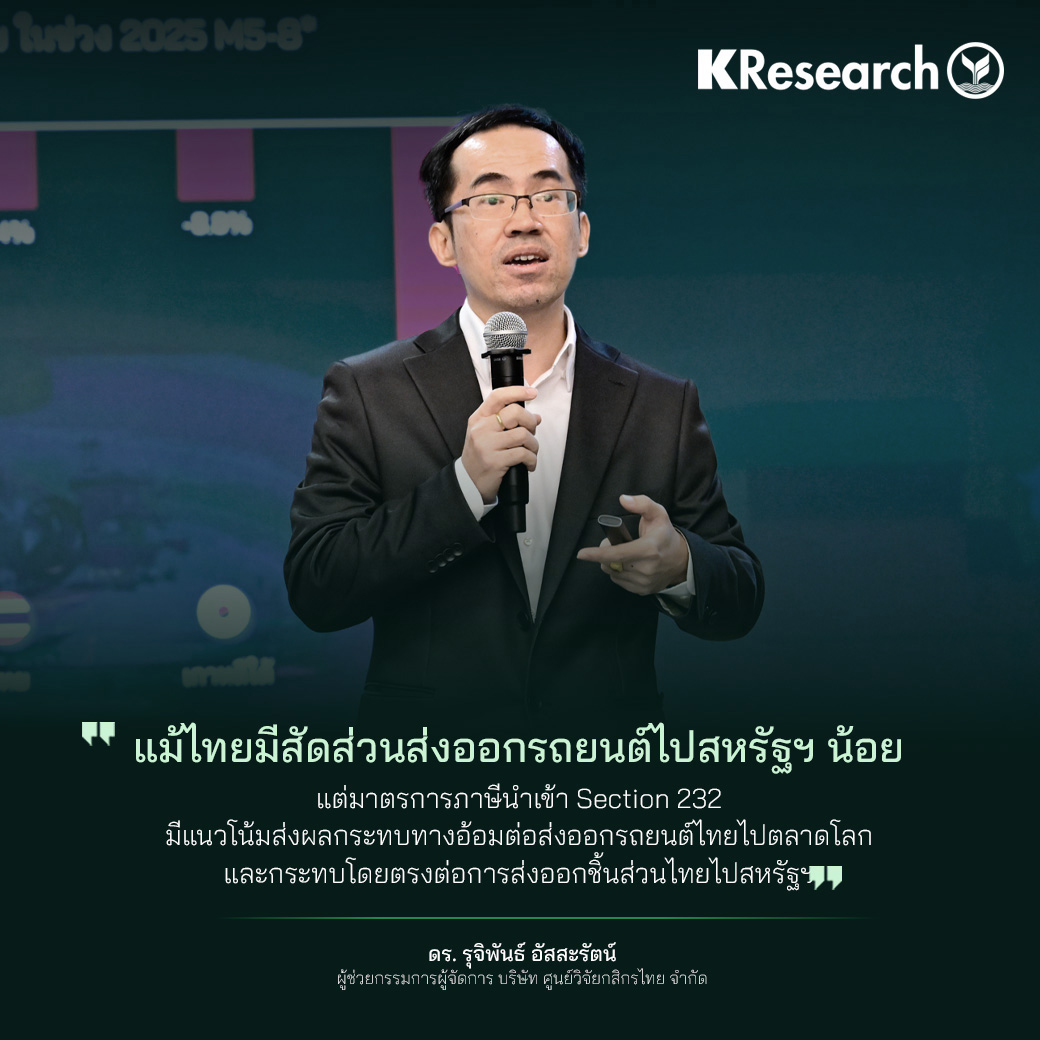 ดร. รุจิพันธ์ อัสสะรัตน์ ผู้ช่วยกรรมการผู้จัดการ บริษัท ศูนย์วิจัยกสิกรไทย จำกัด เผยว่า แม้ไทยมีสัดส่วนส่งออกรถยนต์ไปสหรัฐฯ น้อย แต่มาตรการภาษีนำเข้า Section 232 มีแนวโน้มส่งผลกระทบทางอ้อมต่อส่งออกรถยนต์ไทยไปตลาดโลก เพราะผู้ผลิตรายใหญ่ เช่น ญี่ปุ่นและเกาหลีใต้ อาจกระจายส่งออกไปตลาดอื่นมากขึ้น เพื่อลดการพึ่งพาสหรัฐฯ ซึ่งจะเพิ่มความรุนแรงของการแข่งขันในตลาดโลก ขณะเดียวกัน มาตรการนี้กระทบโดยตรงต่อการส่งออกชิ้นส่วนไทยไปสหรัฐฯ โดยมีสัดส่วนราว 26% ของมูลค่าส่งออกชิ้นส่วนไทย อย่างไรก็ดี ยางล้อขนาดเล็กของไทยยังได้เปรียบในด้านต้นทุนและคุณภาพ นอกจากนี้ ไทยยังได้รับการยกเว้นภาษี Section 232 ตามมาตรการ Import Adjustment Offset ราว 12% ของมูลค่าส่งออกชิ้นส่วน (ไม่รวมยางล้อ) ไปสหรัฐฯ มากกว่าญี่ปุ่นที่อยู่เพียง 3%