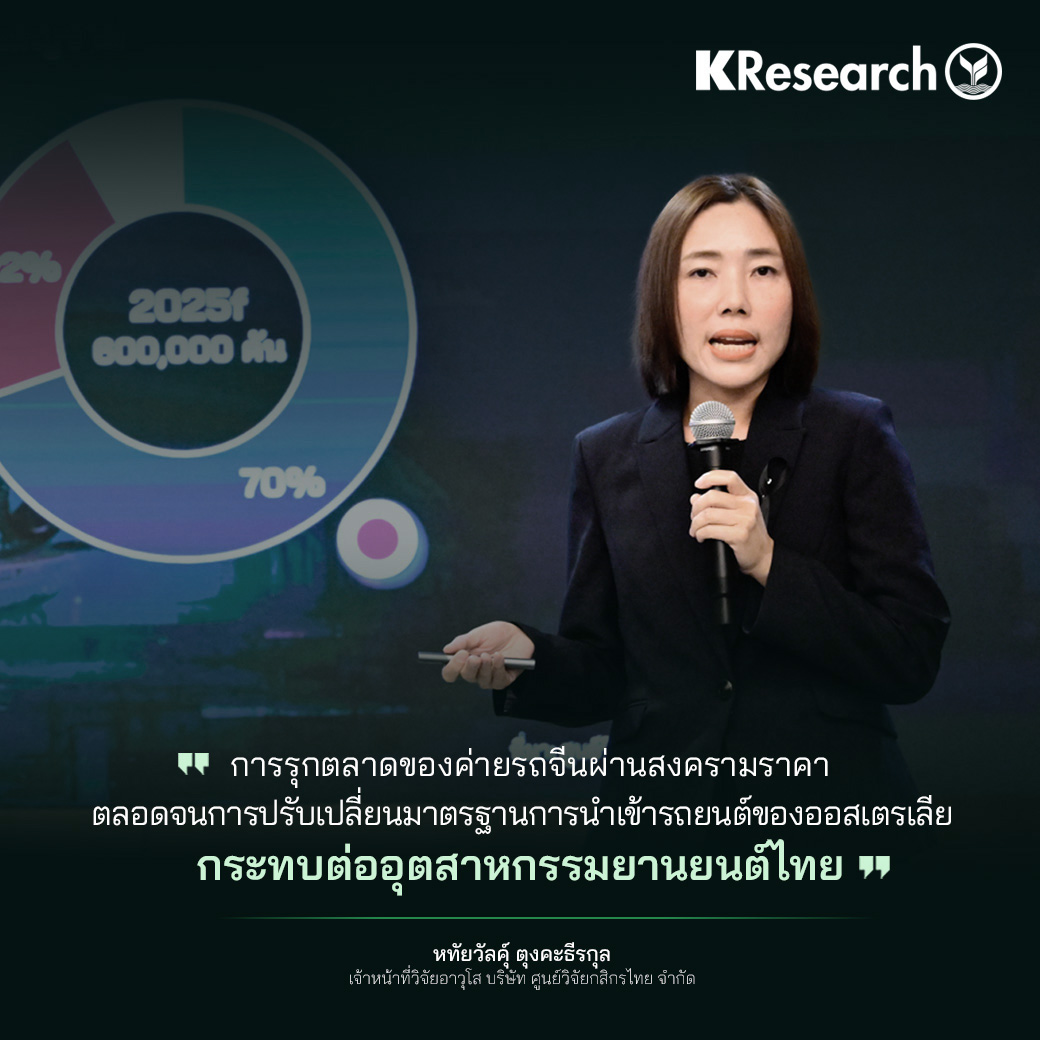 นางหทัยวัลคุ์ ตุงคะธีรกุล เจ้าหน้าที่วิจัยอาวุโส บริษัท ศูนย์วิจัยกสิกรไทย จำกัด กล่าวเพิ่มเติมว่า การรุกตลาดของค่ายรถจีนผ่านสงครามราคา ส่งผลกระทบต่ออุตสาหกรรมยานยนต์ไทยทั้งภาคการผลิตและบริการ หลังจากค่ายรถหลักเดิมสูญเสียส่วนแบ่งในไทยและตลาดโลก เนื่องจากผู้บริโภคหันมานิยมรถไฟฟ้าจีนมากขึ้น ขณะเดียวกัน ออสเตรเลียซึ่งเป็นตลาดส่งออกรถสำคัญของไทย ได้ปรับมาตรฐานการปล่อย CO2 และระบบเบรกให้เข้มงวดขึ้นตั้งแต่ปี 2568 ซึ่งจะหนุนความต้องการรถยนต์ไฮบริดทั้ง HEV และ PHEV แต่ก็จะเป็นแรงกดดันความต้องการรถยนต์แบบสันดาปภายใน หรือ ICE ที่ไทยส่งออกเป็นหลักให้มีแนวโน้มลดลง